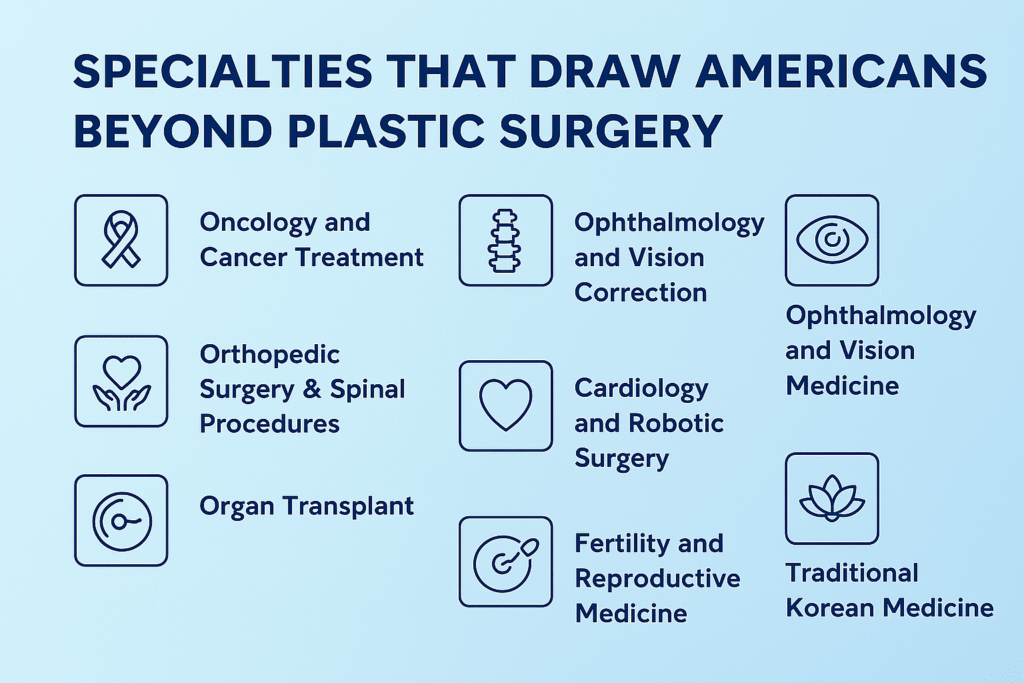 While plastic surgery remains one of the best-known services, the reality of Korean medical tourism is far broader. U.S. patients now travel for: